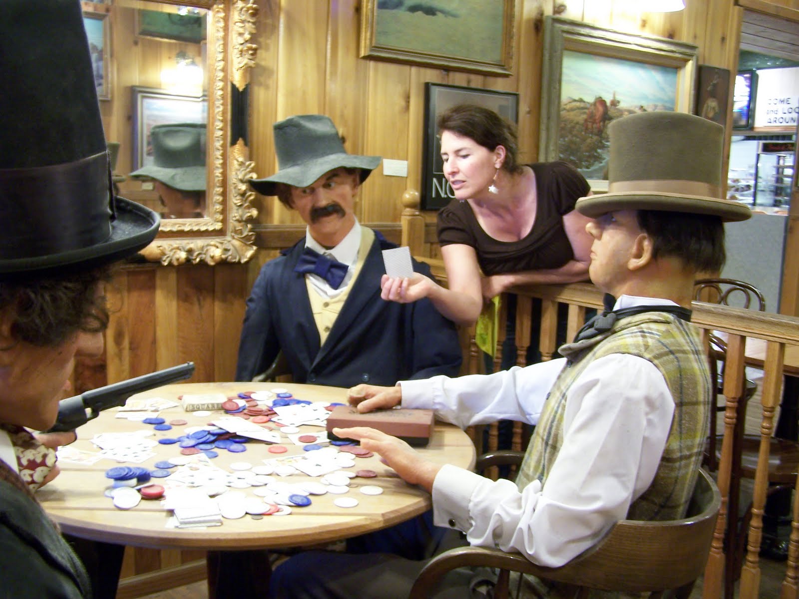 Since we were camping of course it rained. When we awoke the first morning and found our world soggy, we immediately went to plan B ..... find a restraunt and drive to sunshine. Mt Rushmoore would wait till tommorrow. We enjoyed Deadwood our first day. Deadwood is famous as the final resting place of Wild Bill Hickok and Calamity Jane. Hickok was shot while playing poker. He had black aces and eights, now known as a " dead man's hand". The Town of Deadwood